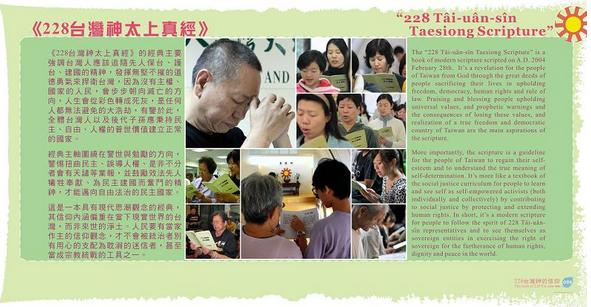 The “228 Tâi-uân-sîn Taesiong Scripture” is a book of modern scripture scripted on A.D. 2004 February 28th. It’s a revelation for the people of Taiwan from God through the great deeds of people sacrificing their lives in upholding freedom, democracy, human rights and rule of law. Praising and blessing people upholding universal values, and prophetic warnings and the consequences of losing these values, and realization of a true freedom and democratic country of Taiwan are the main aspirations of the scripture.